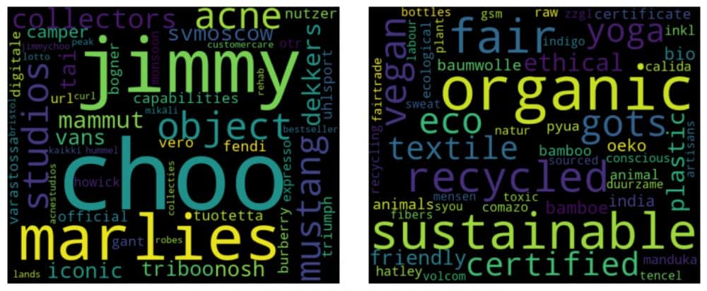 In the EDA (Explorative Data Analysis) stage, we already see some clear differences between data from ‘sustainable’ and ‘not-sustainable’ brands. These two word-clouds contain the most frequent words per class. We ignored words which occurred often at both classes, and we applied a little pre-processing, such as lower-casing and removing punctuation and stopwords. As can be seen in the word-clouds, there is a clear difference between the two classes. Interestingly, we mainly see brand names in the ‘not-sustainable’ word-cloud. Fortunately, the model does not train on the names of the specific brands, which we know trough explainability.
