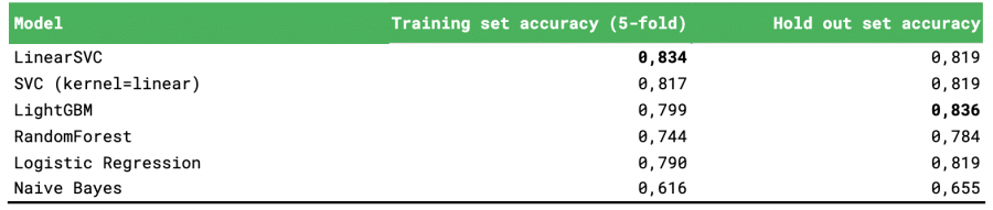 To assign sustainability labels to clothing brands, we make use of supervised machine learning algorithms. After dividing our data into a training and hold out set, we kept improving our model using the results of 5-fold cross validation. We continued using the Linear SVC (Support Vector Machine) classifier, with tfidf-vectors of our data as its input, as this model performed best during cross validation. As shown in the table below, the accuracy is sufficiently high. One could argue that a metric punishing false negatives (‘sustainable’ brands classified as ‘non-sustainable’) even more, could be more appropriate.