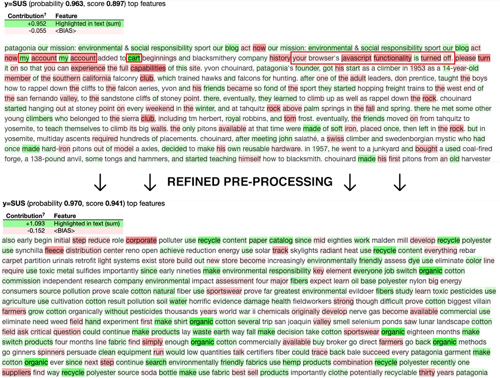 Correct prediction for Patagonia. Using ELI5 to highlight the used important features for making this decision. Lots of noise in the first text snippet, like ‘account’, ‘javascript’, ‘cart’ etcetera. After refined pre-processing, the model chooses more logical important features.