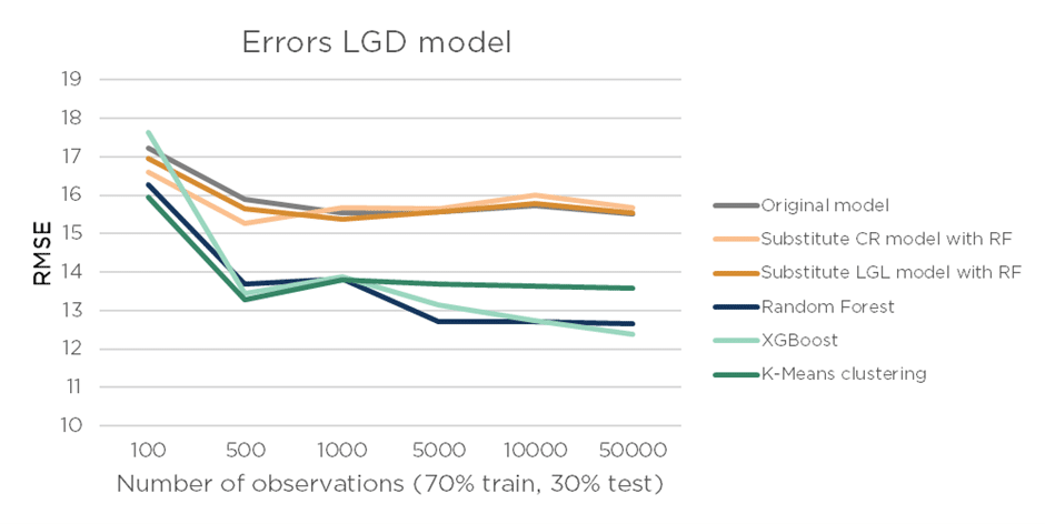 When we let go of the split in the LGD framework we do see improved performance in terms of CLAR and RMSE. Especially, with a larger number of observations the performance improves substantially. Of course, the LGD model without submodels is currently not allowed given the regulation and this is also not expected to change soon (given the clear interpretation in line with client processes). However, these models could very well serve as a challenger model to compare risk drivers and performance, or they can be used in validation of credit risk models.
