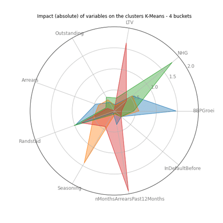 The clusters do not necessarily focus on the same client characteristics. This is visualised in Figure 2, where we look at four clusters. The figure shows the impact of each risk driver on the four clusters. Clearly, the clients representing the clusters and the corresponding levels of LGD differ substantially. This allows the user to easily zoom into the clusters separately and helps to understand why the clients in the clusters are similar.